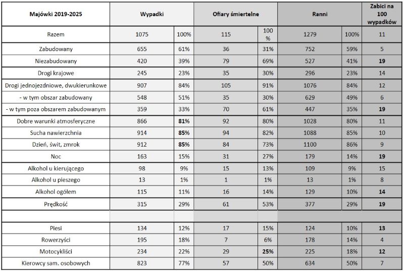 Jak wynika z zestawienia danych, w latach 2019-2025 w dniach 1-3 maja doszło łącznie do 1075 wypadków, w których zginęło 115 osób, a 1279 zostało rannych. Średnio daje to 51 wypadków dziennie, podczas gdy przeciętny dzień weekendowy w tym samym okresie to 55 wypadków.
